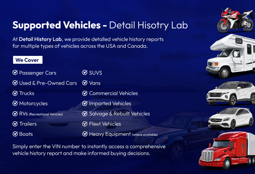 Detail History provides detailed history reports for cars, trucks, motorcycles, RVs, trailers, and boats across the USA and Canada. Make informed decisions before buying any vehicle.